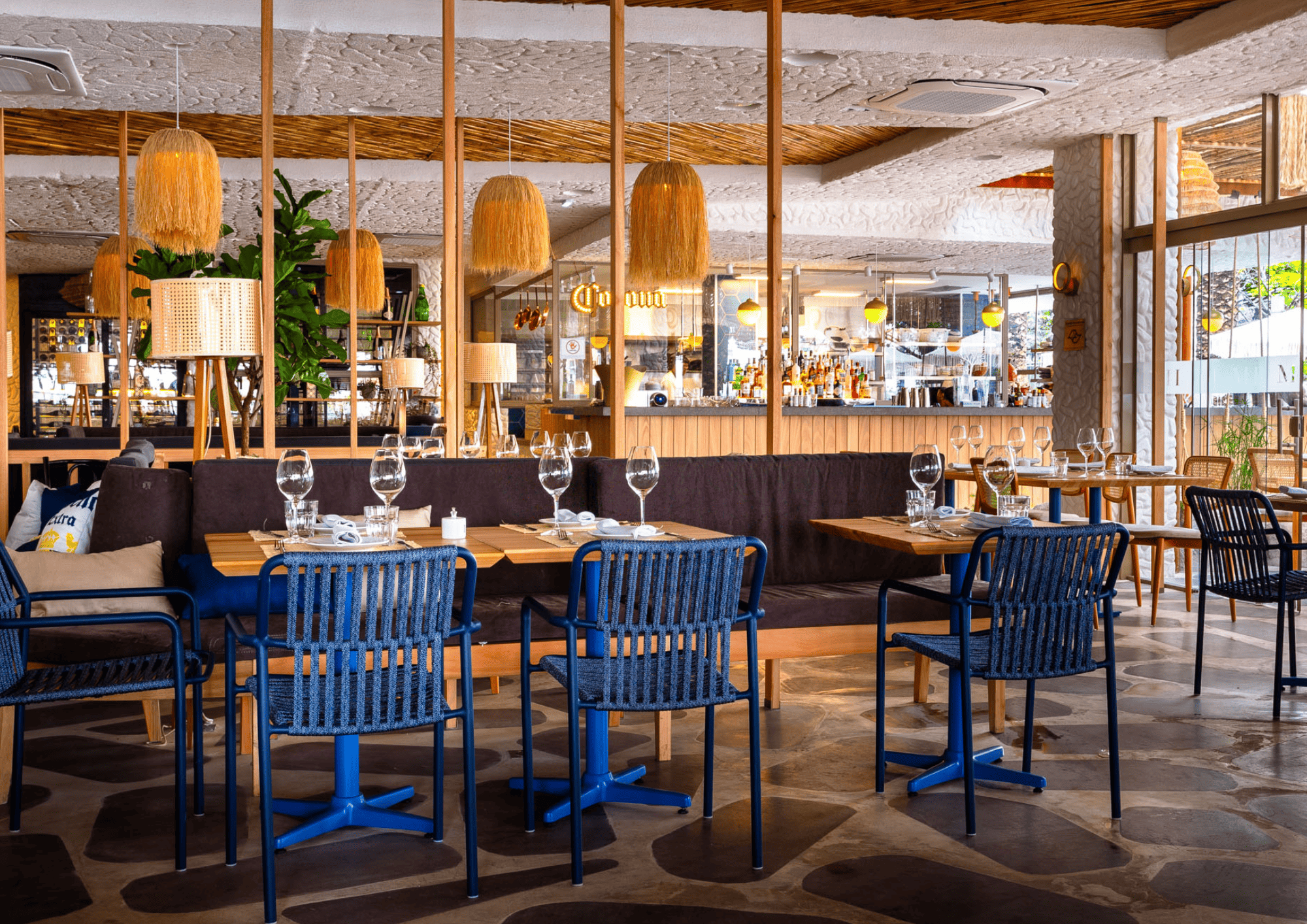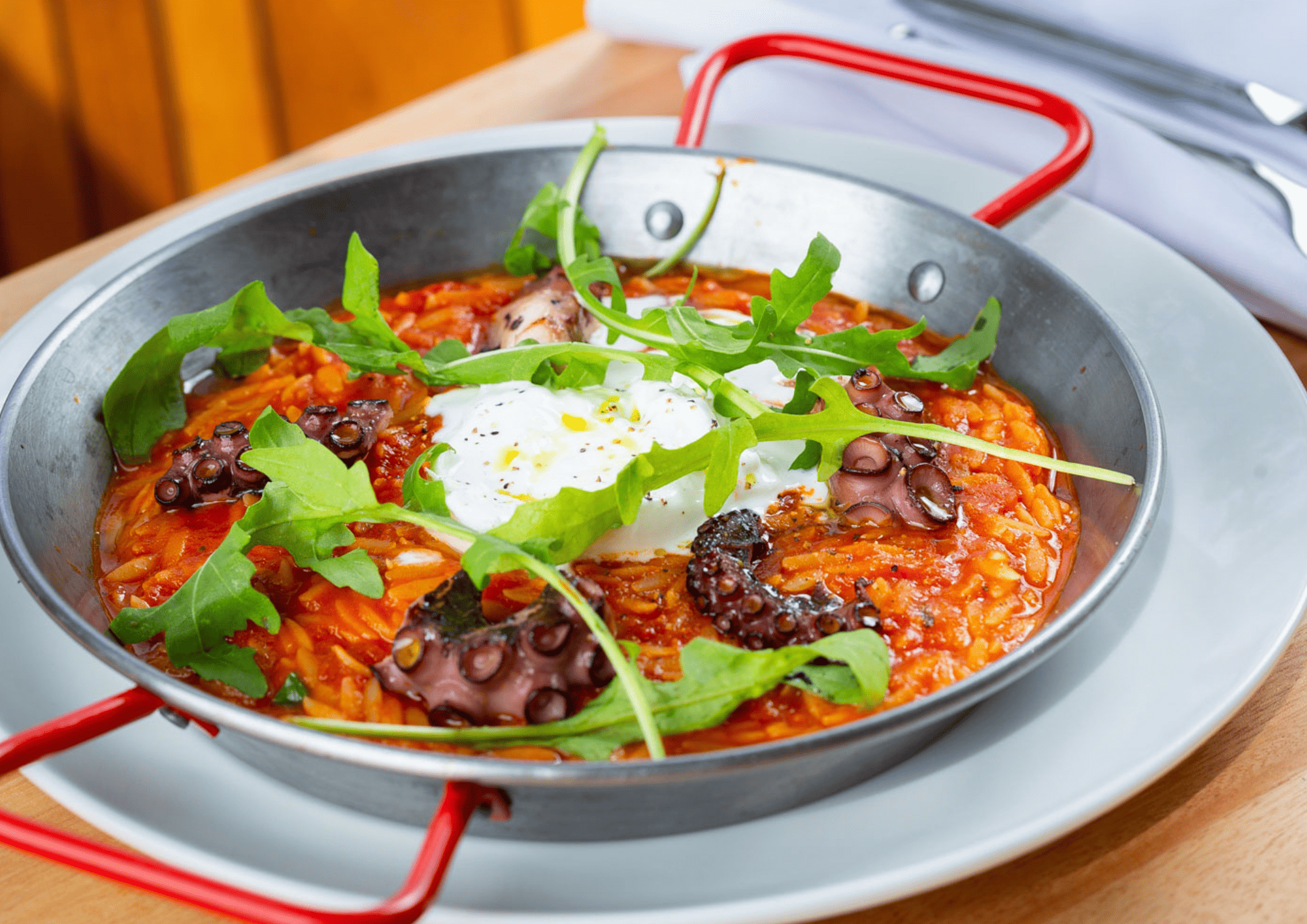 A ideia veio dos primos e sócios que se inspiraram na festiva e luminosa ilha do mar Egeu. Instalado no último andar do complexo, a experiência do visitante começa logo no elevador, que também tem a função de adega. Um belíssimo painel em homenagem ao Sol, todo feito de ripas de madeira ornadas com 4 mil folhas de ouro, impressiona. Quem está à frente do cardápio é o chef Antonio Maiolica, que também comanda o menu do Temperani Cucina, outro restaurante do complexo.