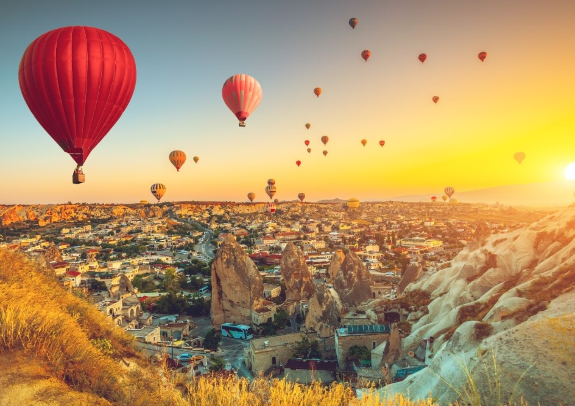 horário de nascimento do sol. Primeiro assistiremos á preparação dos balões e subiremos na cesta e começaremos a passear. Enquanto o balão estiver subindo e descendo, poderemos observar campos verdes e vales, morros, cidades, casas nas cavernas e formações rochosas típicas dessa região. Além da natureza magnífica, alie a isso a oportunidade de ver o sol nascendo lá do alto do balão em um céu azul